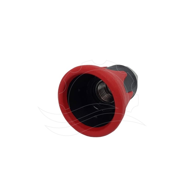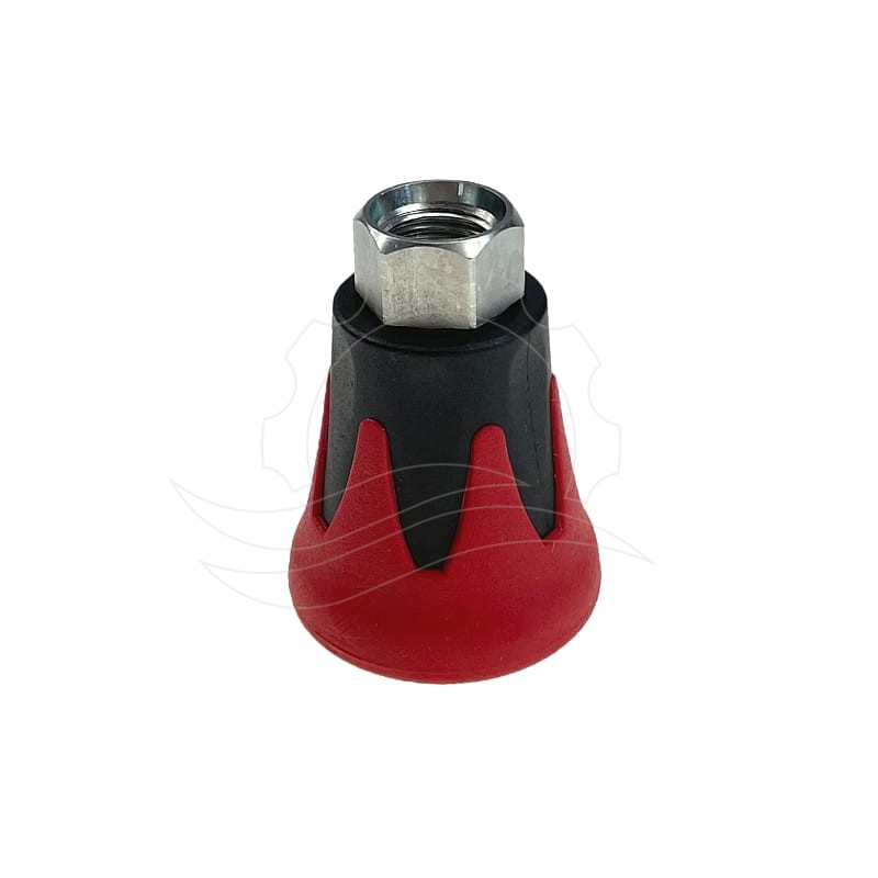 Der Düsenschutz von R+M Suttner ist rot und schwarz. Er besteht aus zwei verschiedenen Kunststoffarten und schützt so sowohl die Düse als auch die zu reinigenden Oberflächen optimal vor Kratzern. Der Innenteil ist aus einem harten, der Außenteil aus einem flexibleren Material gefertigt. Der Kern besteht aus Edelstahl. 1/4"-Gewinde.