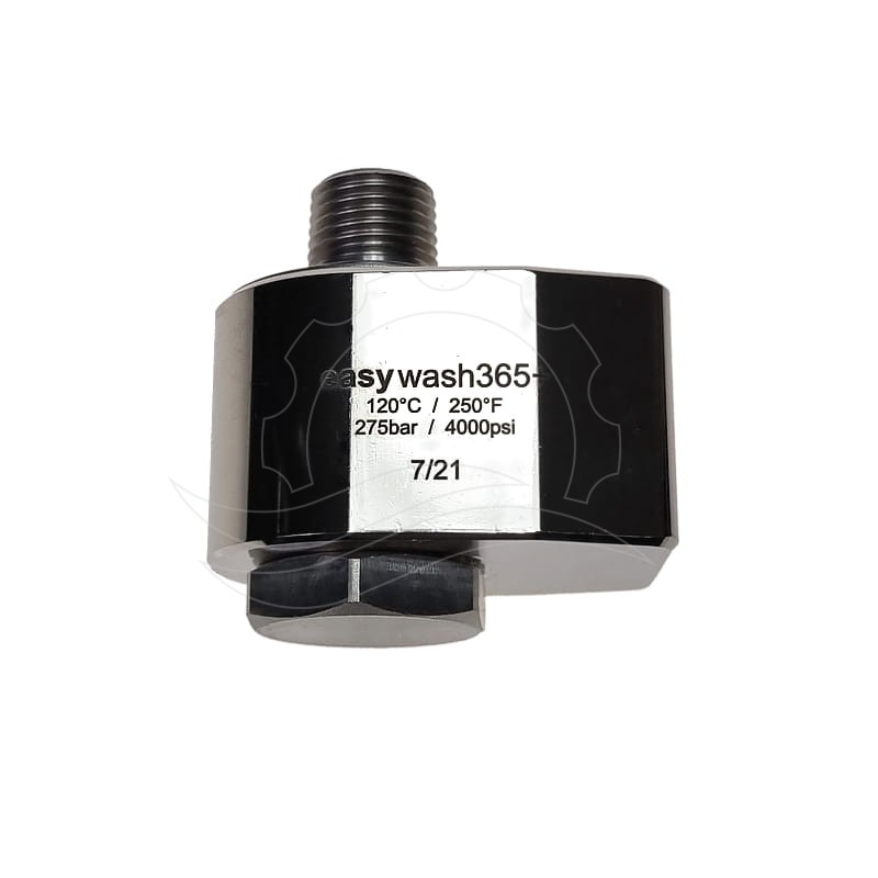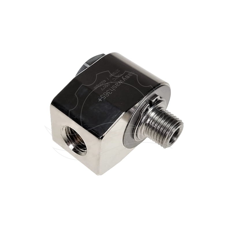 Easywash365+ Winkelgelenkverbinder G3/8''F-G3/8''M. Gehäuse aus vernickeltem Messing. Edelstahlwelle mit 7 mm Durchflussdurchmesser. Maximaler Druck: 275 bar, maximale Temperatur: 120 °C.