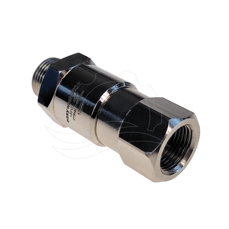 Easywash365+ gerader Drehverbinder G3/8''F-G3/8''M. Gehäuse aus Edelstahl und vernickeltem Messing. Edelstahlwelle mit 6 mm Durchflussdurchmesser. Maximaler Druck: 275 bar, maximale Temperatur: 120 °C.