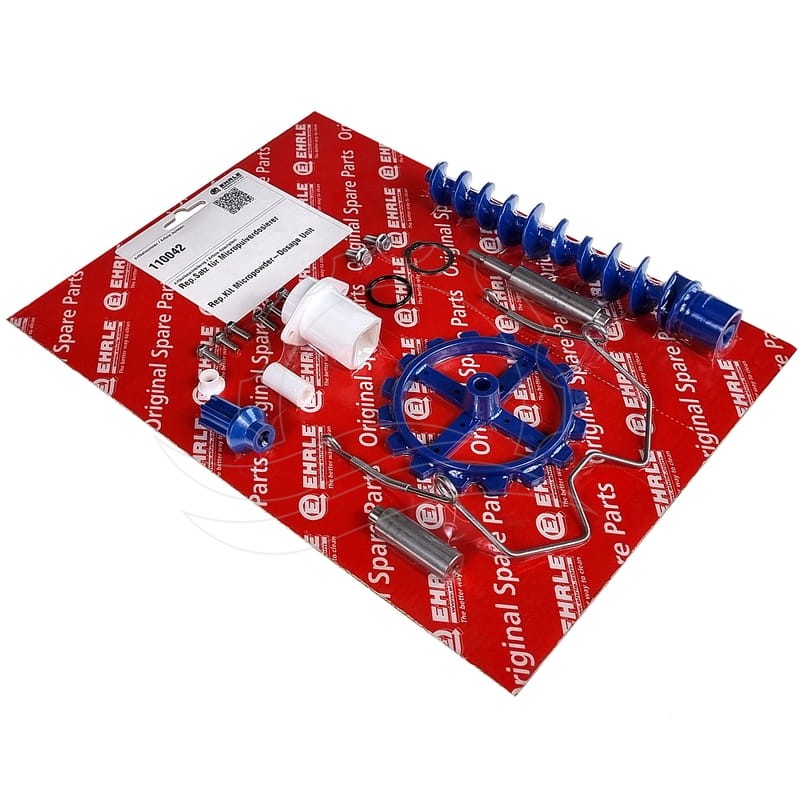 Kompletter Mikropulverdosierer von Ehrle. Das Set beinhaltet: Kunststoffschraube, Mischrad, Radfeder, Auslauf, Dichtung, Sicherungsring und Schrauben.