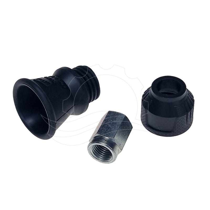 Schwarze Düsenabdeckung von MTM Hydro. Besteht aus drei Elementen. Düsenanschluss aus verzinktem Stahl mit 1/4"-Gewinde.