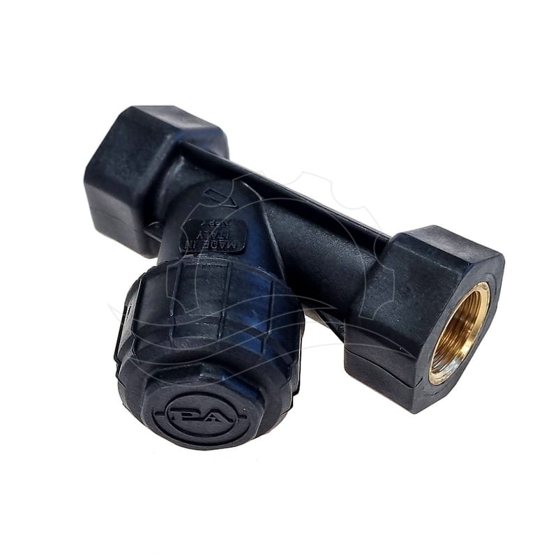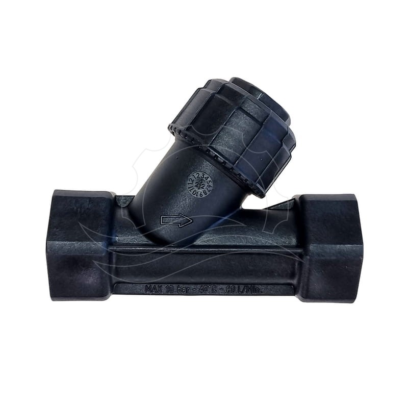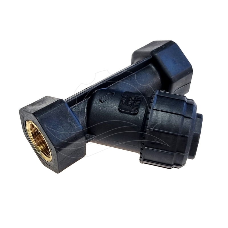 Winkelfilter aus italienischem Kunststoff mit 3/4"-P.A.-Gewinde. Wird typischerweise vor einer Hochdruckpumpe zum Schutz vor festen Verunreinigungen eingesetzt. Der Filter verfügt über ein herausnehmbares Filterelement mit Edelstahlgewebe.
