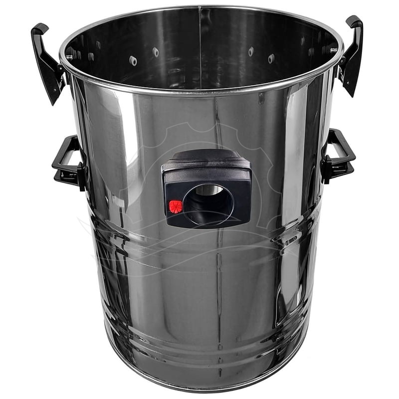 Edelstahl-Staubsaugerbehälter mit 400 mm Durchmesser. Inklusive Griffen, Befestigungshaken für den Deckel und Schlauchanschluss. Passend für Staubsauger von Marken wie BKF und Ehrle.